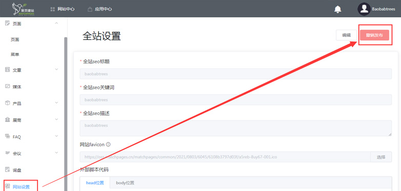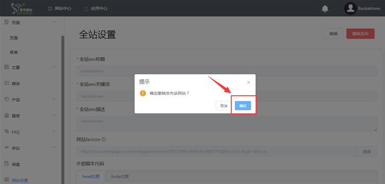 2. 网站设置 > 点击撤销发布