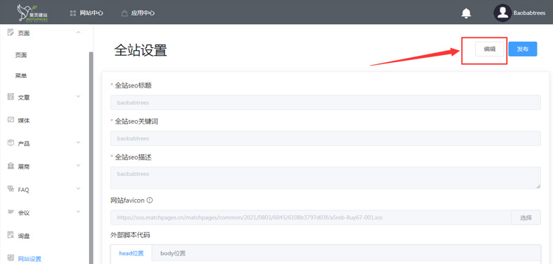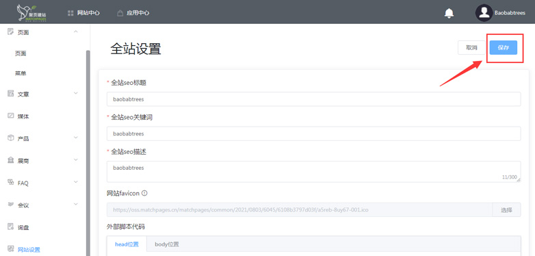 6. 返回页面顶端,点击保存,并发布站点。