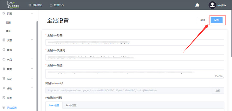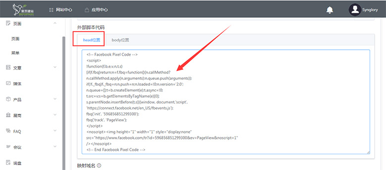 4. 在外部脚本代码框中,选择head位置,并粘贴代码。